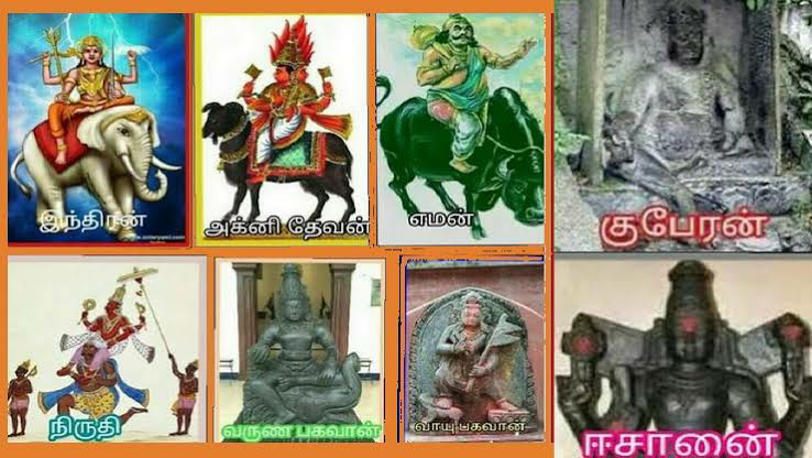 ஆகிய எட்டுபேரும் அஷ்ட திக் பாலகர்கள் என்று அழைக்கப்படுகிறார்கள். ஒவ்வொருவரும் ஒவ்வொரு திசையின் நாயகர்கள். அந்தந்த திசைக்கு அதிபதிகள்.